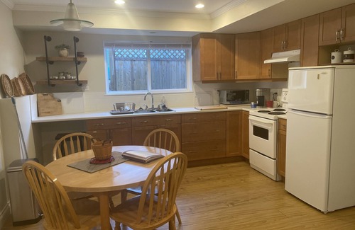Executive suite for adults and families, stays cool all summer, warm in winter, comfy lounge area with TV & fireplace, full kitchen with a table for lovely family dinners, large bedrooms/comfy beds, remote work space, great Wi-Fi, private deck with BBQ/distant water view, amenities such as shopping and eating out are nearby, and 8 walking beaches are nearby. (plus Parksville white sand beach). Week and month stays welcome (washer/dryer available for longer stays). Besides being perfect for working from home, our suite is also central and accessible for skiing, surfing and sightseeing.