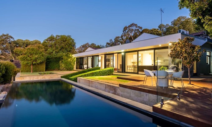 This tastefully furnished retreat accommodates up to 11 guests, making it an ideal choice for large families and groups seeking reconnection and rejuvenation. Fully air-conditioned, the residence boasts five bedrooms, three bathrooms, and a remarkable kitchen overlooking the acclaimed infinity pool and the Perth skyline, ensuring ample space for self-sufficient enjoyment.