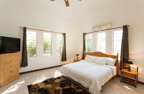 The villa's bedrooms feature a king-sized bed, air-conditioning, and a ceiling fan for your utmost comfort, complemented by an en-suite bathroom with a shower. The main bedroom has large sliding glass doors that lead you to a patio, offering an inviting sitting area with unobstructed views of the beautiful beachfront.