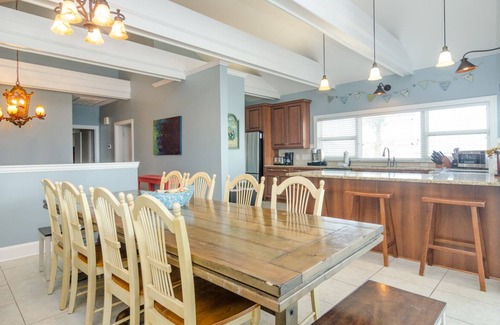 The foyer gently guides you to the main living level of the home, a massive open concept area with stunning ocean views. At the top of the stairs, you are immediately thrust into endless ocean views as you are met with walls of sliding glass doors and high vaulted ceilings with exposed beams that give a very open and welcoming feel to the living space. A wonderful gathering space for families, the heart of this home is furnished with a large dining table, additional bar stool seating and a comfortable sofa that overlooks the ocean front deck. The kitchen has granite counter tops, stainless steel appliances and a sizable pantry which is convenient for storing your groceries.
