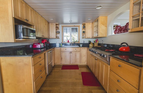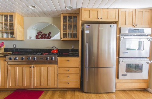- all the expected (and even unexpected) amenities of a luxury vacation home, including multiple flat-screen TVs, Bluetooth-enabled stereo, commercial cooktop/indoor grill, double wall stoves, granite countertops of rose quartz and labradorite, local artwork, designer furniture, bamboo flooring throughout the first floor, and a telescope for whale watching.