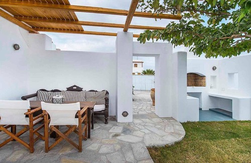 Step into the inviting outdoor space of Arctic Wind, accessible via the private terrace, where comfort meets style. A stone-built BBQ area sets the stage for delightful alfresco dining experiences, while sumptuous sofas, chairs, and sun loungers beckon for relaxation. The plunge pool, perched at the property's edge, overlooks the mesmerizing blue expanse of the Aegean Sea. Adorned with lush greenery and a charming wooden pergola, the poolside area offers natural shade and tranquility.