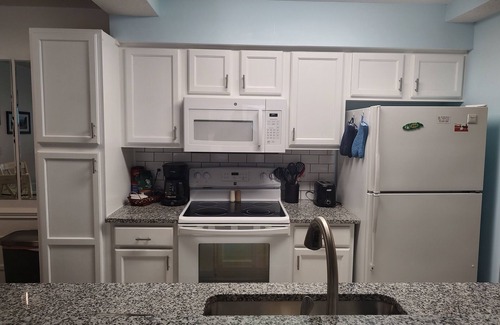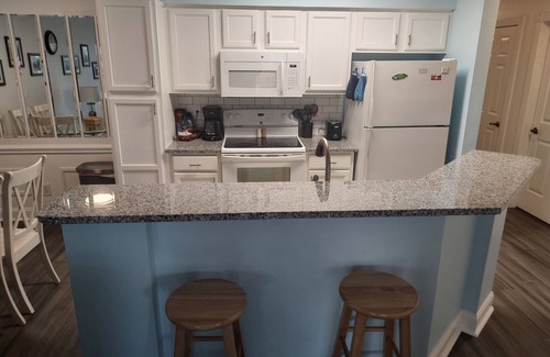 Largest 2 bedroom, 2 bath 1st floor unit (1275sqft) in the complex. Across the street from the Intracoastal Waterway and a short drive to one of the nicest beaches on the east coast (Sunset Beach, NC). Main bedroom has 2 double beds, dresser and a 43" Roku HD TV. The lockout bedroom has 2 double beds, private bath, dresser, 42" Roku HD TV, small fridge, separate air conditioning unit and has it's own separate entrance. Recent updates 1/2025 include new vanity, mirror, lighting & tile flooring in lockout bathroom. New laminate flooring 1/2023, pantry cabinet in kitchen 1/2022. kitchen granite countertops, sink, faucet, tile backsplash & tile floor 1/2020. Full kitchen along with a dining table & 6 new chairs (6/21). In the living room there's a new 65" Roku HD TV (5/24), newer couch, loveseat & recliner (6/21). There's two sliding glass doors to the patio. Just off the patio is a community grill & picnic table. The complex has an indoor and outdoor pool with a indoor hot tub & small workout room. This unit comes completely furnished including bath towels and linens, you only need to bring your beach towels. For your convenience there's Wi-Fi (500Mbps), YouTube TV streaming local & national programming, iron & ironing board and washer & dryer.