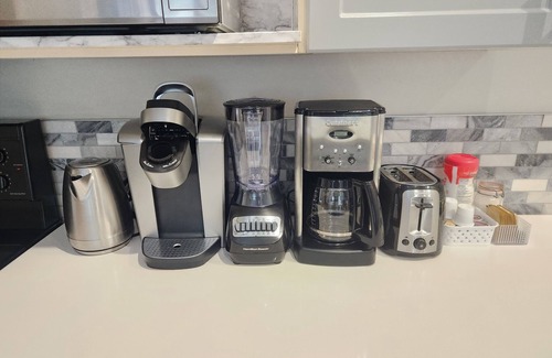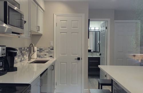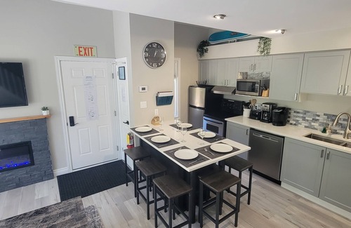 The MAIN floor of the this unit features a huge front entrance deck with picnic table, a fully-equipped kitchen, quartz counters and eating area, sunny living room with feature fireplace and 50" television with Cable and netflix, walk-out to a full size balcony, a 3-piece shower room, and a spacious bedroom with twin beds, flatscreen television and a double closet. Free Wifi Hi Speed Internet / Free Netflix / Free parking