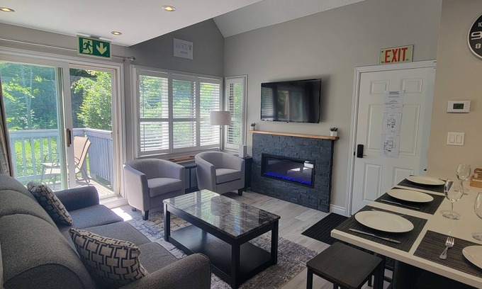 This beautiful modern two-bedroom, two-level condo is located in scenic Collingwood/Blue Mountains, Ontario. Nestled at the base of Blue Mountain with ski-in, ski-out access(snow conditions permitting) to Blue Mountain's North Chair (expert terrain), this tranquil and light-filled vacation home features beautiful views of the surrounding woods,hills, lake and mountain stream, all linens and towels, quick and easy on-site check-in/out and free shuttle service to Blue Mountain Village (A 3-minute drive/15-20 min walk.)