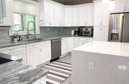 Nestled among the trees in a quiet, residential neighborhood. This spacious 4 bedroom, 2 full bathroom home can accommodate up to 8 people and is perfect for family getaways or tranquil work retreats. The entire house was newly renovated with high end appliances, fixtures, and finishes. This house has beautiful hardwood floors, granite countertops, and gets tons of natural light.