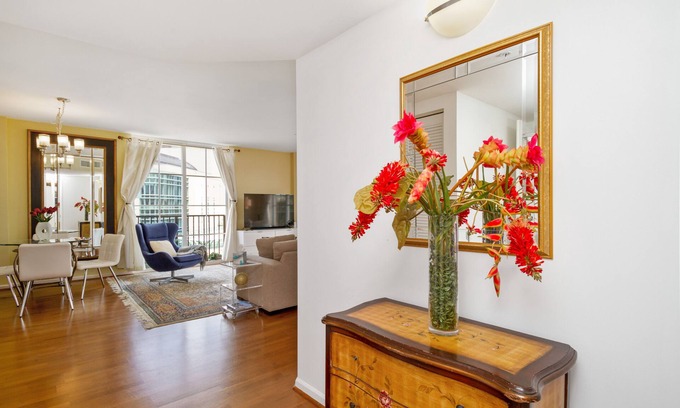 Apartment features a tile Entry Foyer that opens to a 21 Foot Great Room which is divided into a Living Room & Dining Area Combination; Laminate Wood Floors; Large Persian Carpet; 55-inch 4K resolution Flat Screen TV; Free Internet; Designer Furniture, and 2 large wall mirrors. The Floor to Ceiling Sliding Doors in the Great Room provides views of the Garden, the City, and the Kravis Cultural Center.