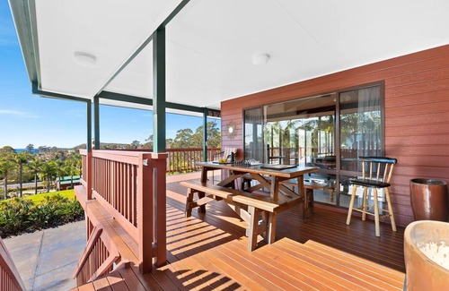 Set high above surburbia, on a large landscaped block is this stunning retreat, with modern amenities spacious living and beautiful ocean views.