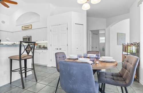 The villa is located at the absolute end of a cul-de-sac, which means no traffic at all, and also, due to the circular set up of the three houses on the cul-de-sac, absolutely no visibility of any neighbors from the pool and deck area, but with a 180 degree view of the golf course and various lakes.