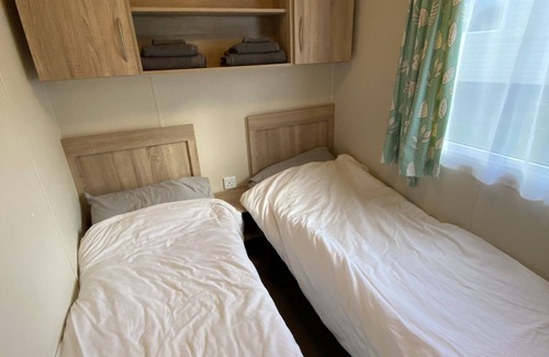 The caravan has two bedrooms, one double bed and the other with two single beds.