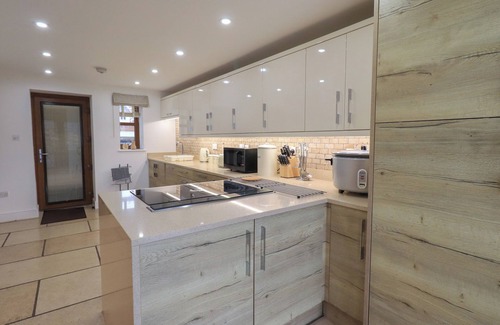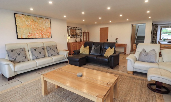 Amenities: Oil central heating, underfloor heating in the living area. Double electric oven, induction hob, microwave, fridge/freezer, washing machine, tumble dryer, dishwasher, kettle, toaster. 2 x Smart TV, table tennis, pool table, darts board, card table, WiFi. Fuel and power inc. in rent. Bed linen and towels inc. in rent. Travel cot and highchair available upon request. Off-road parking for 6 cars. Non-enclosed rear garden with patio, graveled area and furniture. Mid-terrace with furniture. Sorry, no pets and no smoking. Shop 0.2 miles, pub 0.5 miles. Note: No stag/hen parties or similar. Note: The ground floor features several lips and steps throughout, making it unsuitable for those with limited mobility. Note: This property has a Good Housekeeping Bond of £400. Note: Check-in from 5pm, check-out by 9am