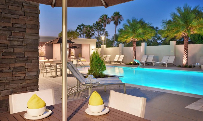 Recreational amenities at the hotel include an outdoor pool and a 24-hour fitness center.