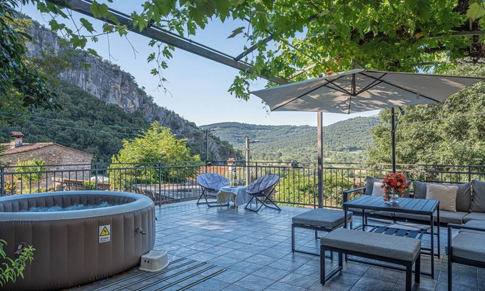 Outside, a private terrace is perfect for al fresco dining. Guests can also enjoy a shared outdoor jacuzzi available from spring to autumn, which requires prior booking with the owner.