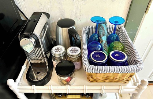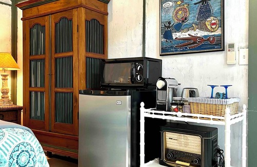 A separate small guest cottage 50 meters from the main house, with a separate private entry if you wish to use a side door, but we encourage you to use our main backyard fence gate. The property is gated, quiet & beautifully kept. The cottage is located next to our large pool, with plenty of separation from the main house. The stained glass window facing the garden, French doors to the pool, and high ceilings all combine to create beautiful mornings no matter what the weather. The cottage main room has a queen size bed, with lounge chairs and a table next to the windows. The attached modern bathroom is fitted with a rain shower head, and beautiful fixtures. There’s no kitchen but you will have a microwave, small fridge, Nespresso coffee machine and electric kettle. Bathroom is equipped with hair dryer and an iron in the closet. There is free on-site parking in the driveway nook. All windows have curtains for your privacy and good sleep.