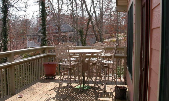 on the deck overlooking the lake or
