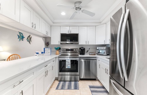 There are many outstanding places to eat out, but cooking at home and making memories with the family is easy. That’s why this kitchen is fully stocked to provide your family with a home cooked meal. Whether preparing a full meal or snacks for the beach or pool, you will find everything that you need in this fully equipped kitchen. There are cooking utensils, silverware, dishes, wine glasses, Keurig and drip coffee maker, microwave, toaster, toaster oven, air fryer, and blender. All you need to bring is food.