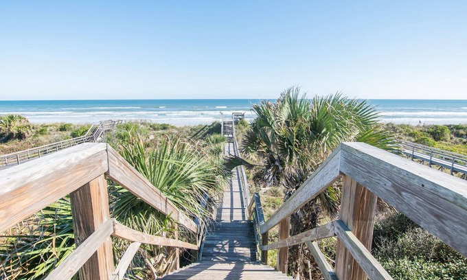 The beautiful beach is a short 540 step (5 minute) walk, that takes you right across the street (using a pedestrian crosswalk signal light), up 2 flights of stairs, and over the ocean dunes as you take in the breathtaking views of one of the best beaches in Florida. If you would like to drive on the beach, beach access for your vehicle is only 0.21 miles/ 1100 feet away to the Crescent Beach entrance. There is also a pavilion with a public beach walkway boardwalk. Beach towels, beach chairs, beach umbrellas and beach toys are available in the condo, just bring your bathing suit.