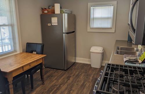 Updated kitchen with gas range, refrigerator, dishwasher, and microwave. The kitchen is equipped with nice pots and pans, silverware, dishes, glasses, a combination K-cup/drip coffee maker.