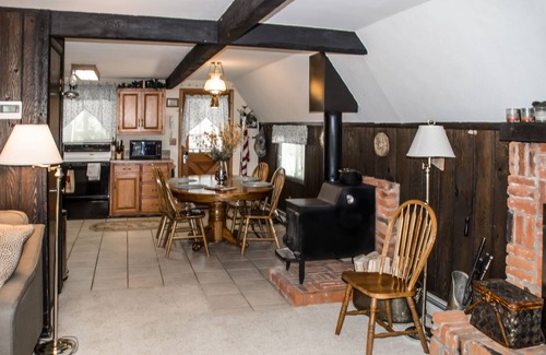 Our cozy, 2-bedroom, 1 bath chalet-style cabin accommodates 6 adults comfortably with a Queen bed in both of the upstairs bedrooms and a Queen sleeper sofa with memory foam mattress downstairs. The bright, sunny rooms are welcoming and allow nice passive solar heating. Linens for bed and bath are provided. The kitchen is equipped with dishes, glasses, pots and pans, utensils, coffee maker, electric tea kettle, blender, linens, microwave, a full-sized refrigerator, dishwasher, and oven with glass cook-top. Our bathroom is downstairs and has a tiled tub/shower combination. The wood stove serves as a very efficient alternative to the radiant baseboard heating and the fireplace offers a romantic element.