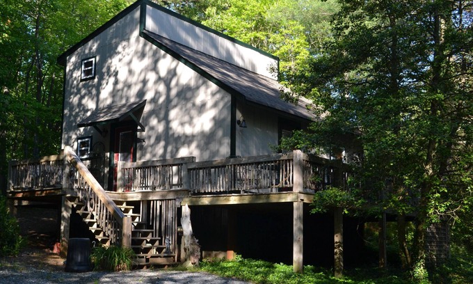 Tucked into the woods, off the beaten path--a perfect place to chill! All the amenities, including wifi, cable, washer/dryer, dishwasher, microwave and gas grill. 10 miles from Blue Ridge, GA. 3 miles from Ocoee River and whitewater rafting. Built by my son, it is not fancy, but very comfortable. A small creek runs through the property, with a firepit/sitting area nearby. One bed, one bath. No shower. Bed and bath are in the loft. New queen-sized bed with Beauty Rest mattress. A great retreat for couples, or for a writer/artist. Go hiking, biking, rafting, shopping, antiquing, fishing, sightseeing or to fairs and festivals during the day, then retreat to the peace and quiet of the rain forest! (Comfortable sofas accommodate 2 more, if needed.)