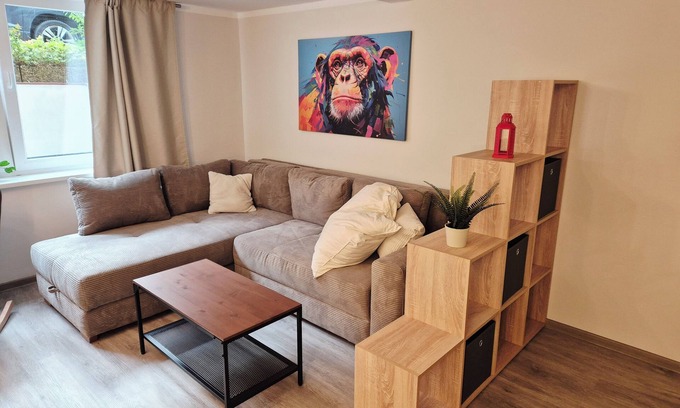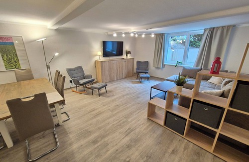 The 55 square meter apartment in the basement offers a large bedroom with 6 variably combinable single beds, a living / dining room with large dining table and 2 sofas. The kitchen is fully equipped with oven, 4-burner stove, coffee maker and fridge with freezer compartment. The bathroom has a shower and bath but is around the corner so you need to go down the hall. This is however not used by other guests! This apartment is ideal for groups or families with several children! You can use the large garden with the other guests, there are various areas to stay and seating available.