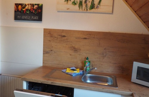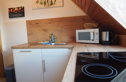 The 50 square meter apartment upstairs offers a large bedroom with double bed, a small adjoining room with 2 single beds, a fully equipped kitchen (new microwave, coffee maker, kettle, toaster, 4 ring stove, fridge) with a bench and 2 chairs and a living room with new armchairs, sleeping couch and board games. On request and for an additional fee, therefore, 5 people in the apartment are possible.