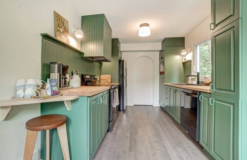 The main floor is home to 1 queen bed and the living spaces. The second floor has 2 more queen beds, and 3 twins in one room, which the kids are sure to love! This space was lovingly decorated by a local designer and shop owner (La Tortue de Wakefield). Be sure to pop by her shop and say hi!