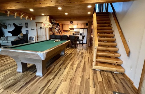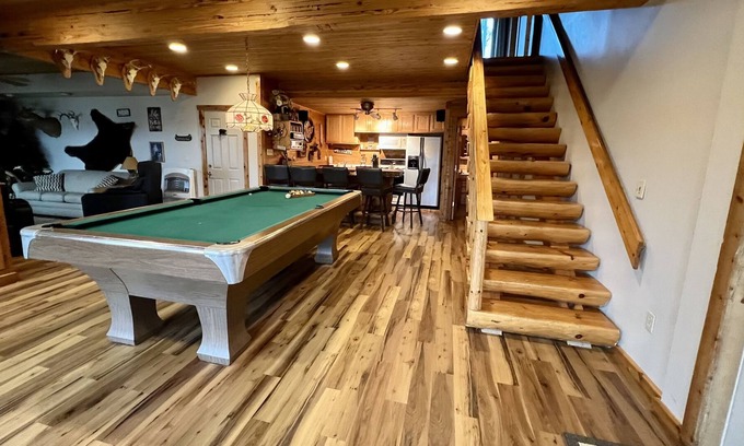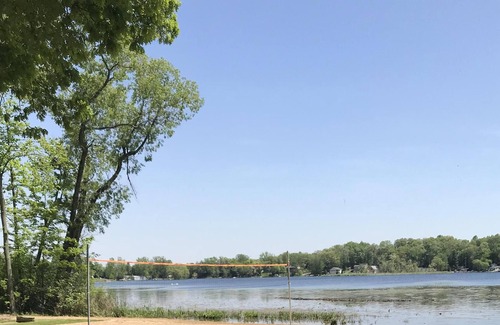 Lake front living on the beautiful all sports lake front log home secluded in the Michigan woods and less than 30 minutes to downtown GR. Boat dock & 10 person pontoon rentable, ask on pricing. Great fishing from the dock, canoe or boat! Outdoor fire pit, gas gril, horseshoe pits, sand volleyball court, pool table & bar.