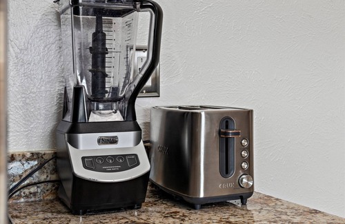 - Full access to our stocked kitchen with stainless steel appliances, Keurig coffee machine, plenty of pots, pans, dinnerware, silverware, blender, crockpot, hand mixer, electric kettle, toaster, oven, paper towel, oil, salt, and pepper.