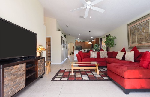 The spacious living room features plush red sofas, a large flat-screen TV, and ample space for everyone to unwind after a day of fun. Enjoy the open-concept layout with natural light streaming in through large windows.