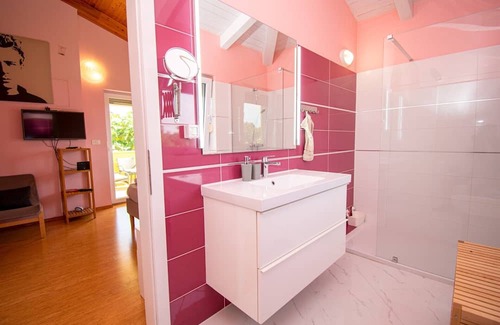 Villa Gaya is an optimal holiday destination for families or friends in the tourist town of Porec, but in a pleasantly quiet location. The warm and tastefully decorated interior welcomes you as a home away from home.The ground floor has an open-plan living room with a sofa bed, dining area, and a direct exit to the outdoor terrace with dining area and pool. A fully equipped kitchen meets your needs. On the ground floor, there is also a bedroom with a double bed and a private bathroom, as well as a guest WC. The 4 other bedrooms with double beds and each with private bathrooms are located on the 1st floor of the villa. All bedrooms are air-conditioned and equipped with TV.The outdoor area is surrounded by a lot of entertainment and features a trampoline, badminton, darts, and a ping pong table. You can enjoy the refreshing pool, sun loungers, sun umbrellas, and an outdoor kitchen, where you can prepare barbecue specialties and enjoy them on the covered dining terrace. The fenced holiday home offers you 2 enclosed private parking spaces.We wish you a pleasant holiday. Distances: post office 5000m, emergency room 3500m, discotheque 5000m, gas station 2500m, restaurant 200m, shop 2000m, center 4000m, sea 4000m, beach 4000m, airport 60000m.