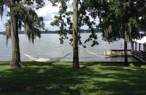 This home has master bedroom with private bath, a queen bedroom, and a bedroom with twin beds. Dining room table seats 8 to 10 comfortably. Kitchen, Dining, and Great Room all open and have great views of lake. A woodburning fireplace and large flat screen TV make house enjoyable in winter as well. Screened porch on back deck overlooking lake provides a great place to watch the sunset over the water. Two docks with chairs for lounging and ladder for swimming. Outdoor fire pit great to sit around, plenty of firewood available! Bocce ball court and corn hole provide family fun! Bring your own boat or rent one from the Marina on Lake Blackshear. Good place to tie up boat at dock for duration of rental.
