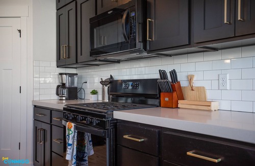The kitchen is stocked with all necessary appliances including a waffle maker and coffee maker. You’ll also find sufficient dish ware and utensils for large groups.