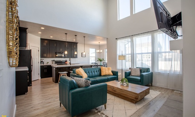 The kitchen, living room, and dining room are all connected and are the heart of the home for gathering, eating, and creating memories. The kitchen is fully stocked and has an island with seating for 4 people. Towards the back of the home, you will find the dining table that seats 6 and provides access to the backyard which is presently unfinished. The living space has a 70" TV over the fireplace surrounded by a stylish couch and two (2) armchairs.