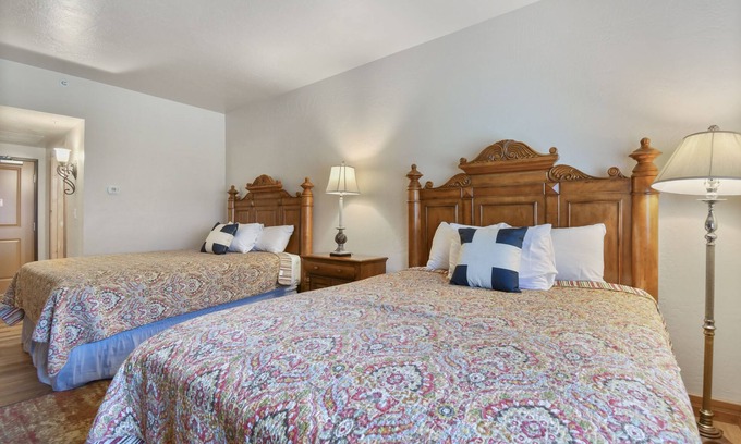 Double Queen (Sleeps 4): Includes 2 queen beds, dresser, flat screen HD television, desk, desk lamp & organizer, nightstand with lamp, full bath/shower with granite countertops and granite surround.