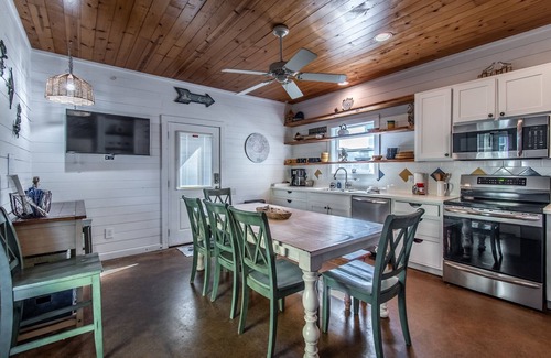Fully equipped kitchen with plenty of counter space, a TV, and a large dining table. Whether you’re enjoying meals, working on puzzles, or just keeping the cooks company, this space is ideal for gathering.