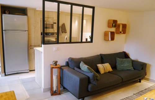 On the ground floor, overlooking the garden, the living room with living room, tv, DVD player, dining room, wood stove and equipped kitchen (induction hob, dishwasher, washing machine, oven, micro- waves, fridge-freezer, toaster, raclette, fondue ...)