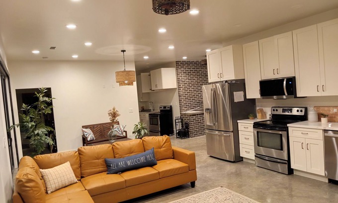 Area #1 ( the studio apartment) sleeps 5-6. There is a flex room with a toddler mattress, perfect for sleeping little ones, so adults can still talk and mingle in the apartment while they nap or go to bed early ect. It has a queen murphy bed, a triple bunk bed, a sofa bed for 1 as well as a 50" TV, a full bath, a kitchen, large fridge, oven range, ample pantry shelving, sofa, and a spectacular view of the valley.