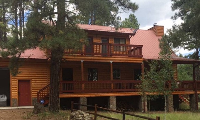 1800 sf 3 bedroom, 2 1/2 bath cabin w/loft in the cool pines of Greer Arizona just minutes away from Sunrise Ski resort and multiple mountain lakes, rivers and hiking trails. This beautiful cabin is hidden on an acre of ponderosa pines and has an outdoor fire pit, swings and a fort for the kids. You can take your family on a hike on one of the the beautiful Mt. Baldy Wilderness trails or on a UTV ride on one of hundreds of forest service roads or just take a peaceful two minute drive to the famous Molly Butler Lodge for lunch,dinner or drinks. the Naughty Pine Cabin has all necessary amenities including TV's in every room, direct tv, wifi, washer and dryer, drip coffee maker, and an open kitchen/family room layout that is perfect for family gatherings. you can also grill on the deck on the supplied gas BBQ grille. After dinner you can relax by the wood burning fireplace or sit on the porch swing on the large front deck or gather around an open fire at the outside fire pit............. sorry but NO PETS!!! .....HWY #260 TO HWY #373.. HEAD TOWARDS GREER. GO JUST PAST HWY #87 TO HAESLETT DRIVE..TURN RIGHT AND GO APROX 500 YARDS. TURN RIGHT AGAIN AND WE ARE THE MIDDLE CABIN WITH THE RED ROOF.