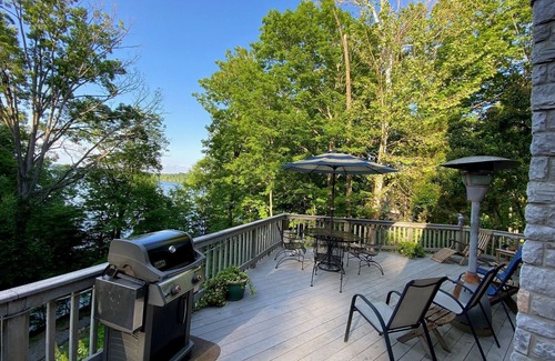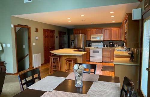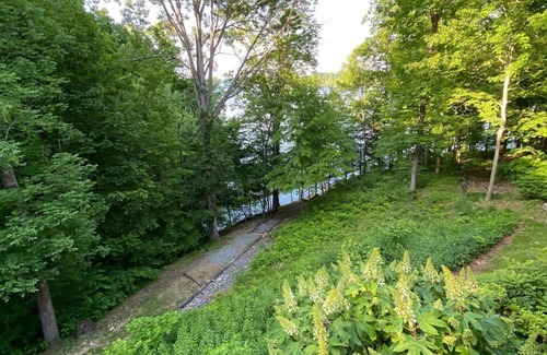 This is a great home for a family lake vacation. The easy walk down access to the lake makes it great for swimming and Kayaking. Enjoy gorgeous forested lake views from both deck levels of this lodge style home sitting on Barren River Lake. The main floor has one bedroom (king bed), bath with jetted tub and walk-in shower, open concept vaulted ceiling living room with stone fireplace, kitchen (stove/oven, dishwasher, microwave, large refrigerator/freezer) with wrap around bar counter top, stools and dining area. The kitchen is fully stocked with pots, pans, dishes and silverware for 12, Krups coffee maker, and expresso machine. The large upper deck is a walk-around from the front to the back lake view. There is a Weber propane grill, table and outdoor heater plus lots of seating. The main floor has French doors to the upper deck with lake views from kitchen, dining and living room. Lower level has a second living/dining room/game room with stone fireplace, large screen TV, Xbox 360, DVD player, board games and a kitchen area with sink, small refrigerator and microwave. The covered lower deck is great for enjoying lake views and the occasional rain showers and easy access enter with steps to a private path to the lake. Two downstairs bedrooms and a full bath. One bedroom has two twin size bunk beds and the second has a queen size bed with attached bath. There are multiple air mattress in the downstairs closet if additional beds are required. All bed linens and bathroom towels are provided. There is a full laundry with washer and dryer in the lower level. The driveway at the home will accommodate multiple vehicles, no need for street parking. There are single and double kayaks, canoes, boat dock for rent at the house, no need to go anywhere to rent and return.