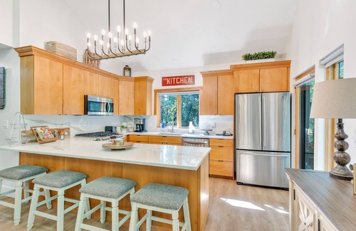 The high ceilings are complemented by the floor-to-ceiling windows that provide a view of the outdoors. Bright living room features plenty of seating space to enjoy a game night around the remote controlled fireplace. Flat screen TV with multiple streaming platforms. Fully equipped kitchen with dishwasher, range oven, coffee and tea, blender, toaster and more! Dining table seats 6 people and the kitchen island has 4 counter stools.
