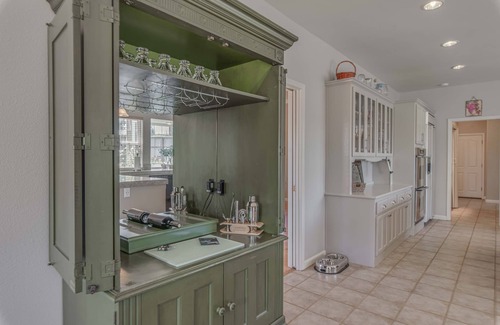 The bright, fully equipped kitchen features a large island with vegetable sink, ample counter space, and all the essential appliances and kitchenware you’ll need, including 3 ovens! Or venture outside to grill your favorite BBQ dish.