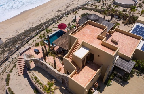 After a great day of vacation fall asleep to the soothing sound of surf outside your door and wake up to sunrise over the Sea of Cortez. Reduce your carbon footprint in a beautiful solar powered beachfront home yet enjoy Air Conditioning in each bedroom! If you're looking to get away from it all, this private palace on a 2 acre estate sits atop a breeze-catching bluff right on the beach. Come here to get away from the crowds and enjoy the quiet that is the East Cape, just 18 miles from Los Cabos International Airport.