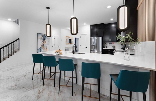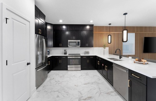 Whether you’re whipping up or warming up your vacay meals, this masterful Kitchen will help you handle it all with ease. The cabinets and drawers are fully stocked with tableware and cookware. The gadgets and appliances allow for all kinds of cooking (or reheating). And the large black island–which doubles as a breakfast counter with 5 comfy stools–offers a ton of space to prep or lay out a spread.