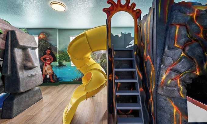 (4 twins; 2 fulls) From the wall art to the lifelike sculptures, the ‘Volcano Adventure’ themed bedroom is FIRE! Lifelike decor elements surrounding two of three cozy bunk beds transport you to a tropical oasis, filled with swaying palm trees and faux stone sculptures of mystical figures. Across the room, a lava-covered ladder and a vibrant yellow tube slide allow fearless explorers to descend from the top of the third bunk bed, as if escaping the molten magma. Completing the immersive experience, vivid wall art portrays a lush jungle scene, with towering trees adorned with abundant, leafy foliage–inviting imaginations to get fired up in this thrilling volcanic paradise.