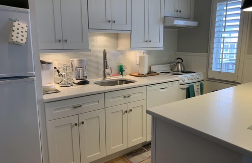 The newly-renovated apartment features brand new furnishings, a full kitchen with pristine appliances and full-sized island with seating for four, a working fireplace, Optimum high speed internet in the living room and smart TV in the bedroom, air conditioning/heat and ceiling fans.