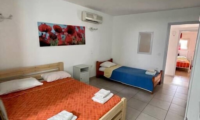 Three-room apartment for 6 people with two double bedrooms, dining area with kitchenette, 2 bathrooms and private outdoor terrace, located in the Vrysi area, about 1 km away from the chora.