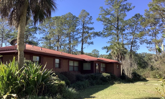 Set in isolation 800' off the street on a cement driveway, our brick home is conveniently located only 3 miles from Live Oak. It is surrounded by 200+ acres of commercial timberland and old-growth, upland hardwood forest.