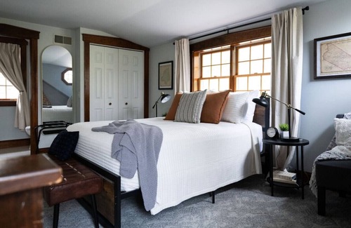 -The second floor loft includes a bedroom with a queen bed, large closet and half bath. The space is decorated in a modern farmhouse theme that merges the history of the space with modern comforts.