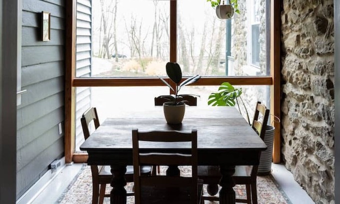 -Guests enter the Spring House through a private porch entrance onto the first floor which includes a bookcase lined open living room with sofa, loveseat and Smart TV. The dining room showcases an exposed stone wall and looks out into the yard through a floor to ceiling picture window.